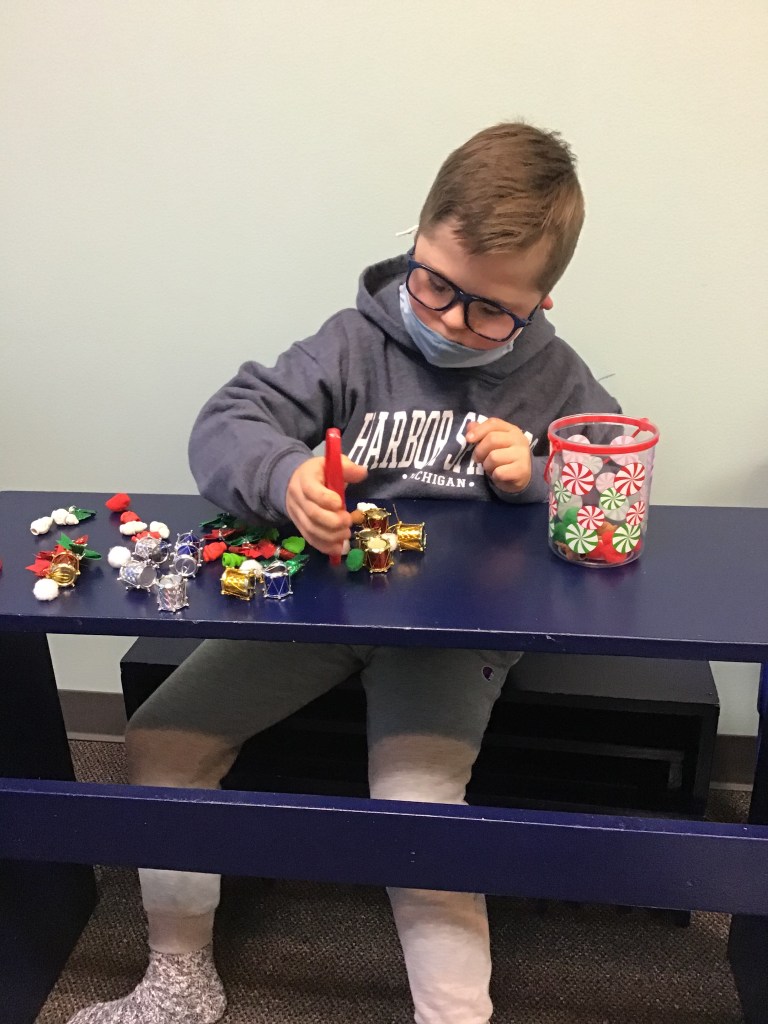 As the holidays start to roll around, the special holiday themed activities come to life! This week, we started playing a fun fine motor activity that will help your child work on a number of skills including direction following, attention to task, fine motor strengthening, sequencing, and visual motor skills.