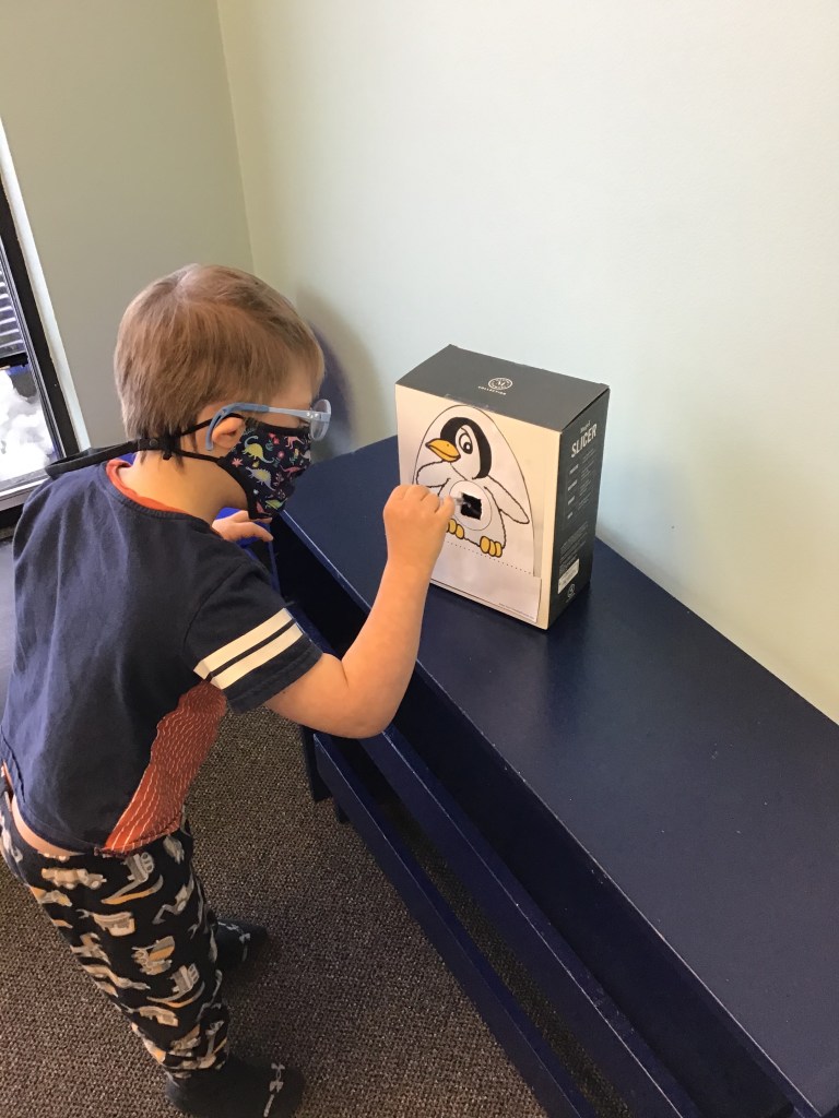 One fun way to work on both fine motor and visual motor integration is this winter-themed penguin activity. Take a small box, and using a knife cut out a 1 ½ inch square in the center. Your child can decorate the box however they like (you can see we chose a penguin theme). The hole will be how we feed the “penguin”.