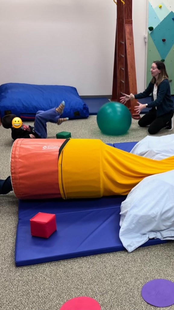 - Play catch with a therapy ball, but have your child lay on their backs with their elbows supporting their upper body. Throw the ball, and have them kick it to you with both feet!