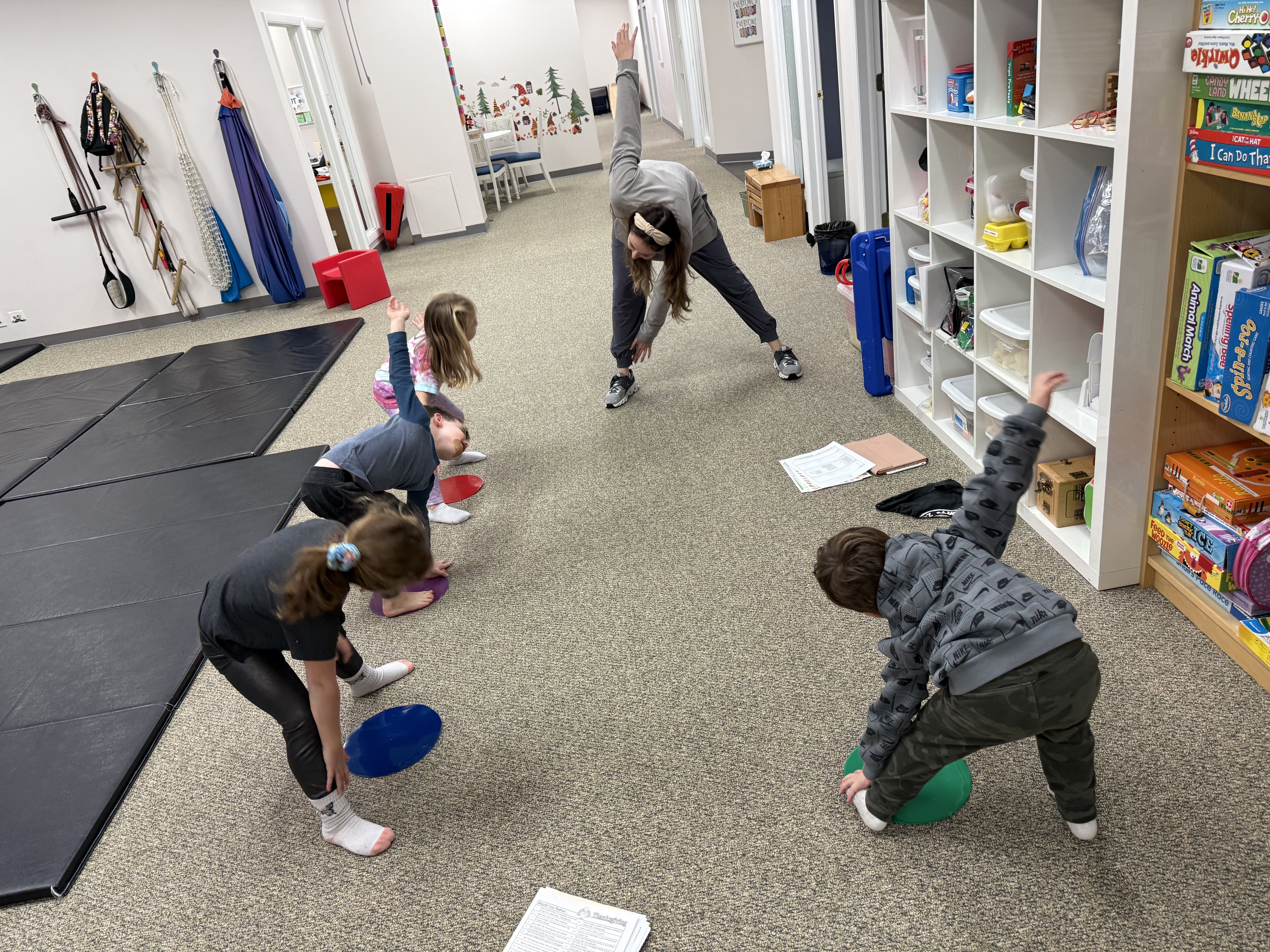 We can hardly believe it but Thanksgiving is right around the corner! I wanted to give you all a glimpse into what we have been working on in clinic. We had so much fun playing a “Would You Rather?” Thanksgiving game. Some of the questions included options like would you rather wash your hair with mashed potatoes, or take a bath in gravy? In between these silly questions, we did gross motor movements like the windmills seen above. These movements provide proprioceptive input, as well as an opportunity to practice crossing mid line. Our pre-K group can be seen working towards this above, and we will continue to practice!